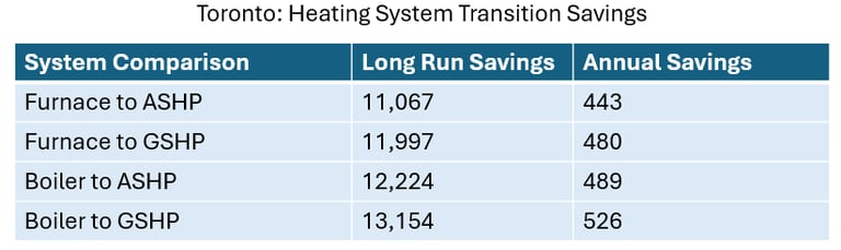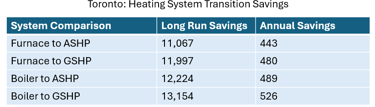 Figure 2. Comparison of energy bill savings associated with various heating technologies, Toronto.